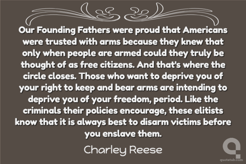 Our Founding Fathers were proud that Americans were trusted with arms because they knew that only when people are armed could they truly be thought of as free citizens. And that's where the circle closes. Those who want to deprive you of your right to keep and bear arms are intending to deprive you of your freedom, period. Like the criminals their policies encourage, these elitists know that it is always best to disarm victims before you enslave them.