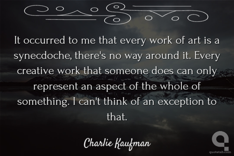 It occurred to me that every work of art is a synecdoche, there's no way around it. Every creative work that someone does can only represent an aspect of the whole of something. I can't think of an exception to that.