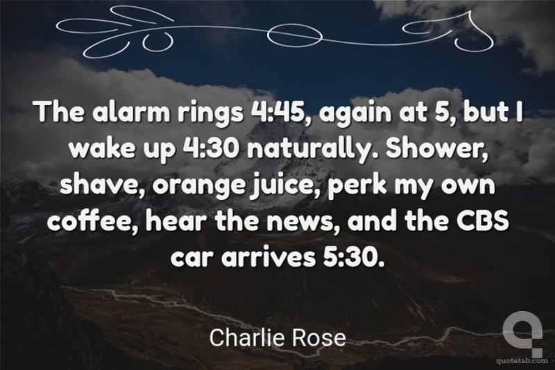 The alarm rings 4:45, again at 5, but I wake up 4:30 naturally. Shower, shave, orange juice, perk my own coffee, hear the news, and the CBS car arrives 5:30.