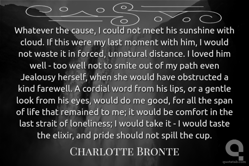 Whatever the cause, I could not meet his sunshine with cloud. If this were my last moment with him, I would not waste it in forced, unnatural distance. I loved him well - too well not to smite out of my path even Jealousy herself, when she would have obstructed a kind farewell. A cordial word from his lips, or a gentle look from his eyes, would do me good, for all the span of life that remained to me; it would be comfort in the last strait of loneliness; I would take it - I would taste the elixir, and pride should not spill the cup.