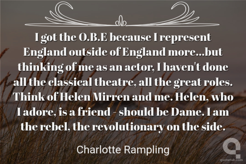 I got the O.B.E because I represent England outside of England more...but thinking of me as an actor, I haven't done all the classical theatre, all the great roles. Think of Helen Mirren and me. Helen, who I adore, is a friend - should be Dame. I am the rebel, the revolutionary on the side.