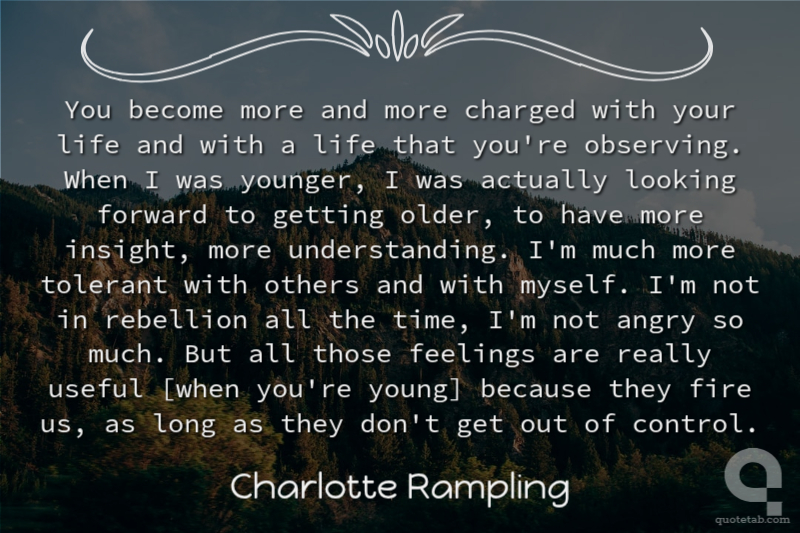 You become more and more charged with your life and with a life that you're observing. When I was younger, I was actually looking forward to getting older, to have more insight, more understanding. I'm much more tolerant with others and with myself. I'm not in rebellion all the time, I'm not angry so much. But all those feelings are really useful [when you're young] because they fire us, as long as they don't get out of control.