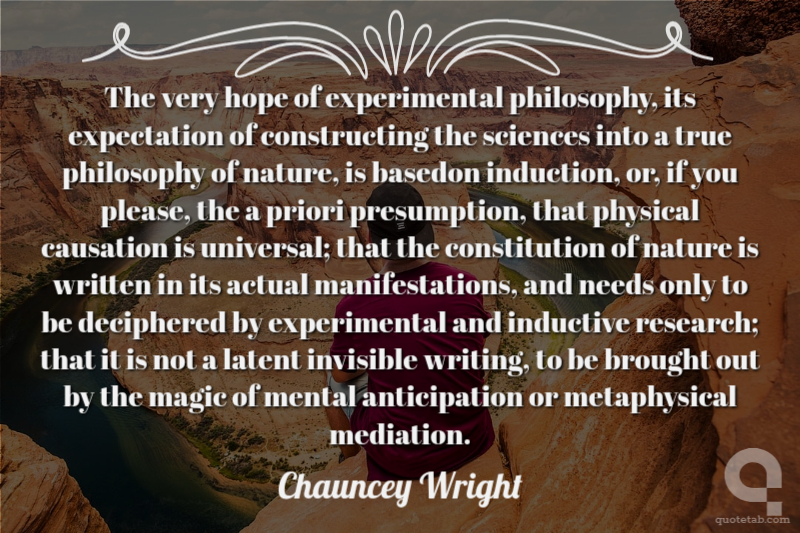 The very hope of experimental philosophy, its expectation of constructing the sciences into a true philosophy of nature, is basedon induction, or, if you please, the a priori presumption, that physical causation is universal; that the constitution of nature is written in its actual manifestations, and needs only to be deciphered by experimental and inductive research; that it is not a latent invisible writing, to be brought out by the magic of mental anticipation or metaphysical mediation.