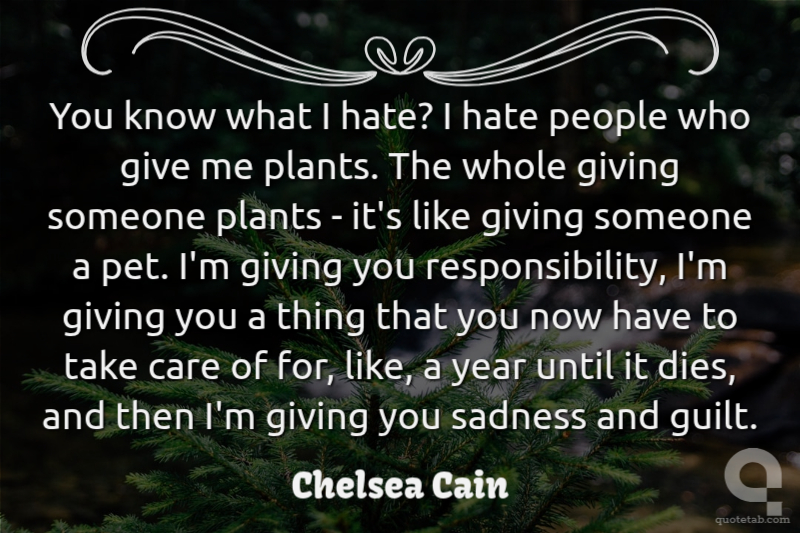 You know what I hate? I hate people who give me plants. The whole giving someone plants - it's like giving someone a pet. I'm giving you responsibility, I'm giving you a thing that you now have to take care of for, like, a year until it dies, and then I'm giving you sadness and guilt.