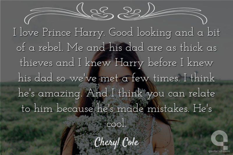 I love Prince Harry. Good looking and a bit of a rebel. Me and his dad are as thick as thieves and I knew Harry before I knew his dad so we've met a few times. I think he's amazing. And I think you can relate to him because he's made mistakes. He's cool.