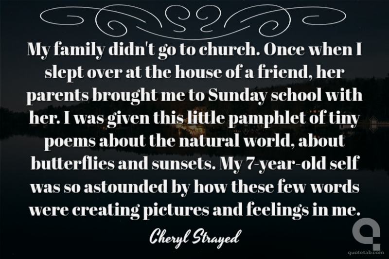My family didn't go to church. Once when I slept over at the house of a friend, her parents brought me to Sunday school with her. I was given this little pamphlet of tiny poems about the natural world, about butterflies and sunsets. My 7-year-old self was so astounded by how these few words were creating pictures and feelings in me.