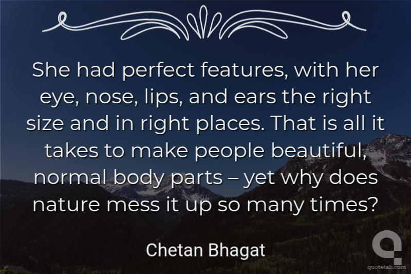 She had perfect features, with her eye, nose, lips, and ears the right size and in right places. That is all it takes to make people beautiful, normal body parts – yet why does nature mess it up so many times?
