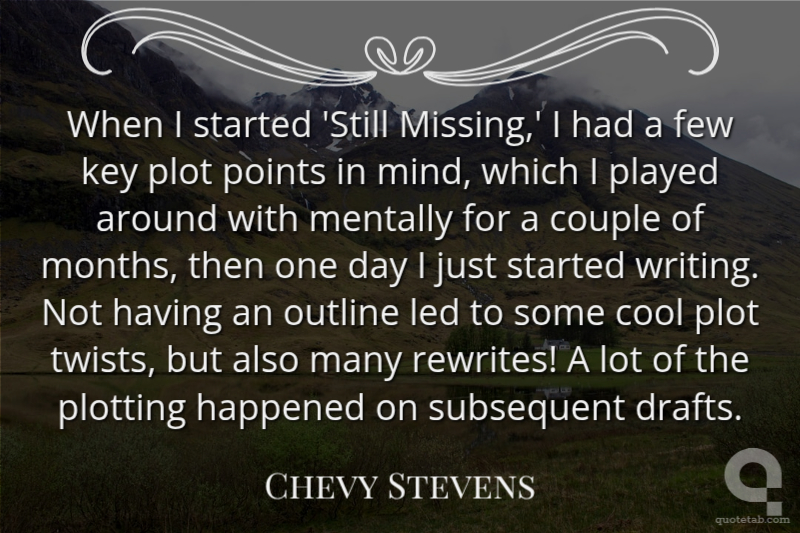 When I started 'Still Missing,' I had a few key plot points in mind, which I played around with mentally for a couple of months, then one day I just started writing. Not having an outline led to some cool plot twists, but also many rewrites! A lot of the plotting happened on subsequent drafts.