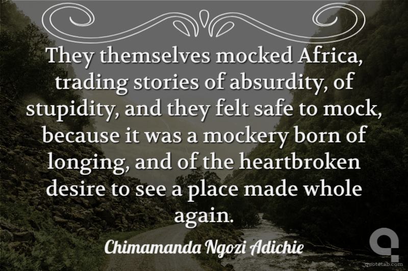 They themselves mocked Africa, trading stories of absurdity, of stupidity, and they felt safe to mock, because it was a mockery born of longing, and of the heartbroken desire to see a place made whole again.