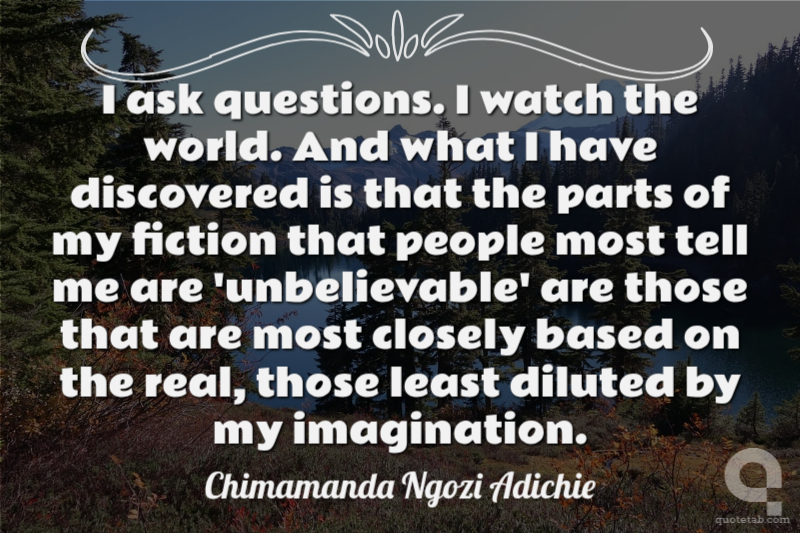 I ask questions. I watch the world. And what I have discovered is that the parts of my fiction that people most tell me are 'unbelievable' are those that are most closely based on the real, those least diluted by my imagination.