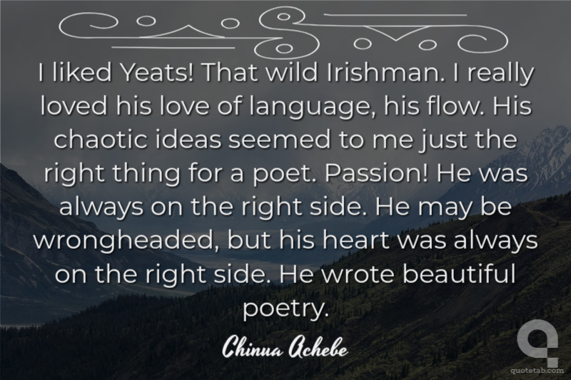 I liked Yeats! That wild Irishman. I really loved his love of language, his flow. His chaotic ideas seemed to me just the right thing for a poet. Passion! He was always on the right side. He may be wrongheaded, but his heart was always on the right side. He wrote beautiful poetry.
