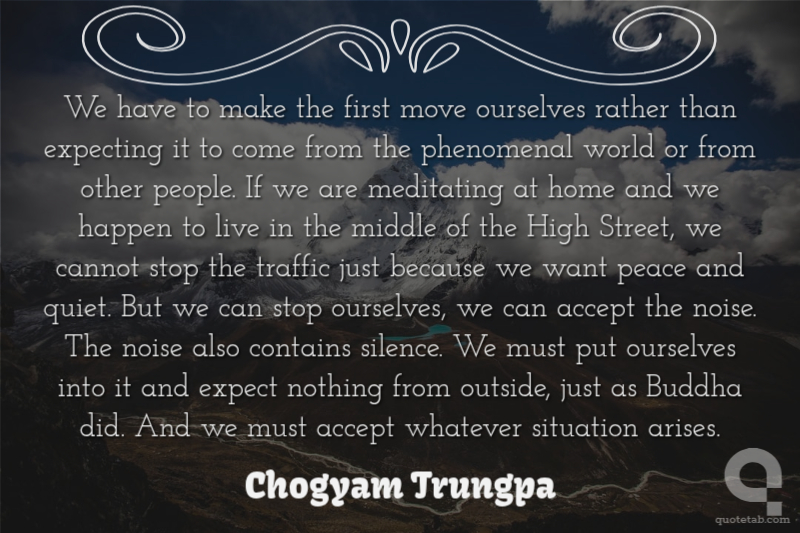 We have to make the first move ourselves rather than expecting it to come from the phenomenal world or from other people. If we are meditating at home and we happen to live in the middle of the High Street, we cannot stop the traffic just because we want peace and quiet. But we can stop ourselves, we can accept the noise. The noise also contains silence. We must put ourselves into it and expect nothing from outside, just as Buddha did. And we must accept whatever situation arises.