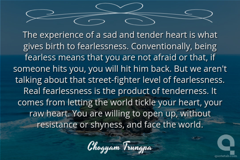 The experience of a sad and tender heart is what gives birth to fearlessness. Conventionally, being fearless means that you are not afraid or that, if someone hits you, you will hit him back. But we aren't talking about that street-fighter level of fearlessness. Real fearlessness is the product of tenderness. It comes from letting the world tickle your heart, your raw heart. You are willing to open up, without resistance or shyness, and face the world.