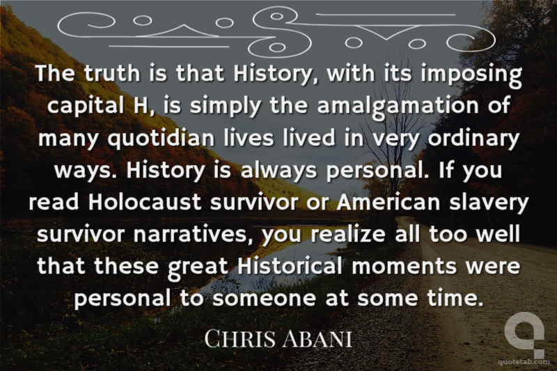 The truth is that History, with its imposing capital H, is simply the amalgamation of many quotidian lives lived in very ordinary ways. History is always personal. If you read Holocaust survivor or American slavery survivor narratives, you realize all too well that these great Historical moments were personal to someone at some time.