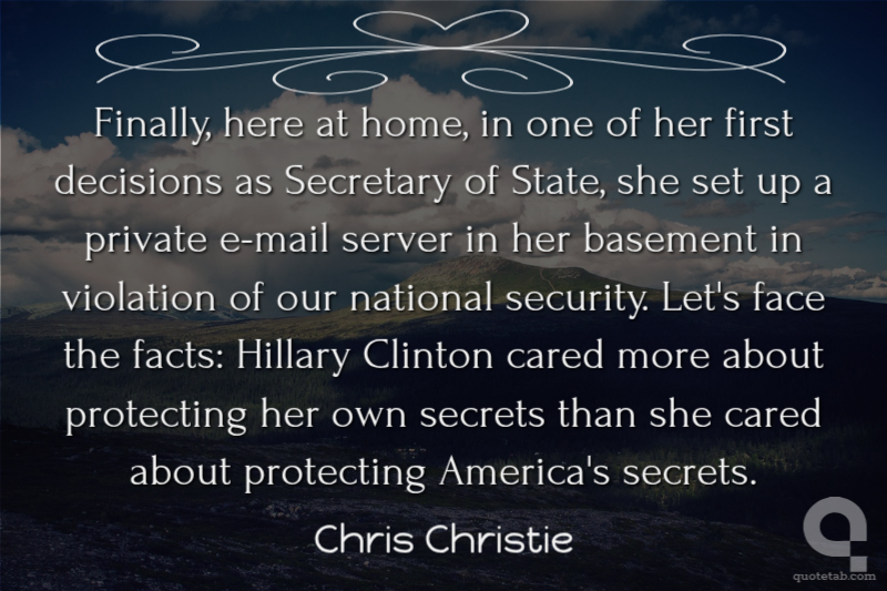 Finally, here at home, in one of her first decisions as Secretary of State, she set up a private e-mail server in her basement in violation of our national security. Let's face the facts: Hillary Clinton cared more about protecting her own secrets than she cared about protecting America's secrets.
