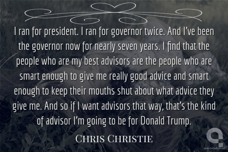I ran for president. I ran for governor twice. And I've been the governor now for nearly seven years. I find that the people who are my best advisors are the people who are smart enough to give me really good advice and smart enough to keep their mouths shut about what advice they give me. And so if I want advisors that way, that's the kind of advisor I'm going to be for Donald Trump.