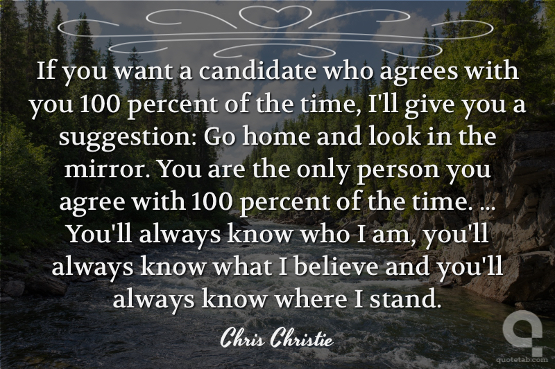 If you want a candidate who agrees with you 100 percent of the time, I'll give you a suggestion: Go home and look in the mirror. You are the only person you agree with 100 percent of the time. ... You'll always know who I am, you'll always know what I believe and you'll always know where I stand.