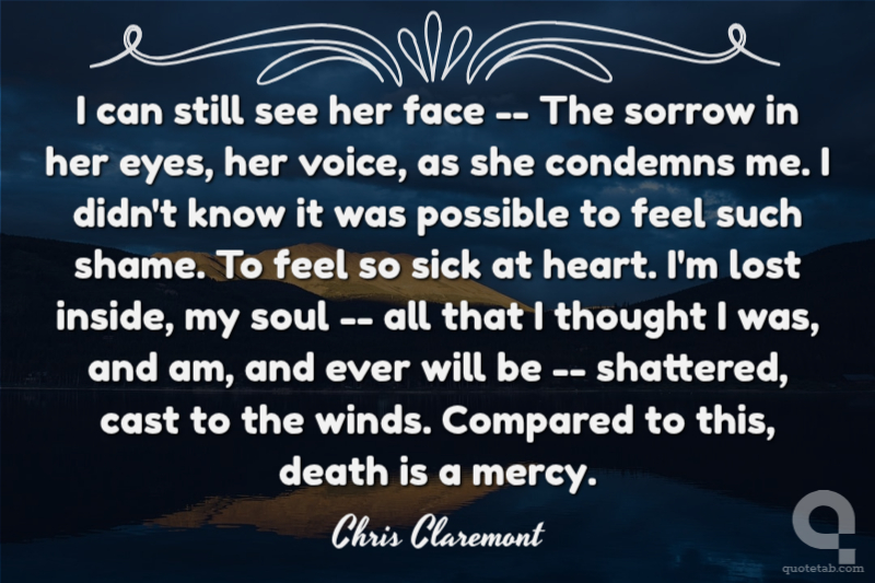 I can still see her face -- The sorrow in her eyes, her voice, as she condemns me. I didn't know it was possible to feel such shame. To feel so sick at heart. I'm lost inside, my soul -- all that I thought I was, and am, and ever will be -- shattered, cast to the winds. Compared to this, death is a mercy.