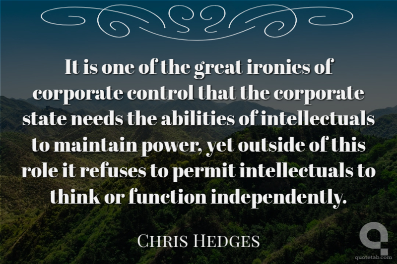 It is one of the great ironies of corporate control that the corporate state needs the abilities of intellectuals to maintain power, yet outside of this role it refuses to permit intellectuals to think or function independently.