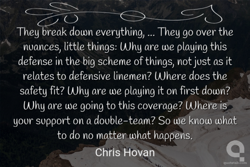 They break down everything, ... They go over the nuances, little things: Why are we playing this defense in the big scheme of things, not just as it relates to defensive linemen? Where does the safety fit? Why are we playing it on first down? Why are we going to this coverage? Where is your support on a double-team? So we know what to do no matter what happens.