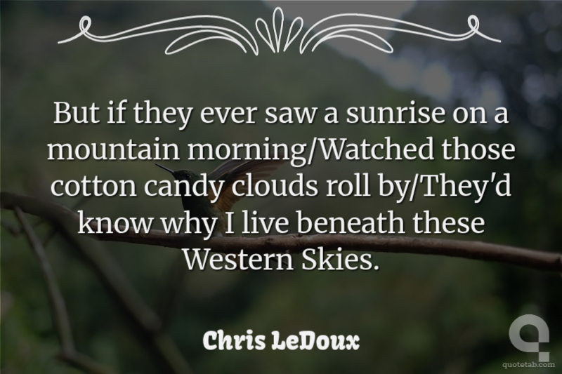 But if they ever saw a sunrise on a mountain morning/Watched those cotton candy clouds roll by/They'd know why I live beneath these Western Skies.