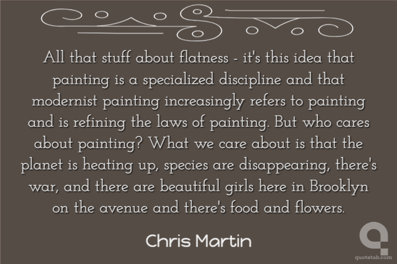 All that stuff about flatness - it's this idea that painting is a specialized discipline and that modernist painting increasingly refers to painting and is refining the laws of painting. But who cares about painting? What we care about is that the planet is heating up, species are disappearing, there's war, and there are beautiful girls here in Brooklyn on the avenue and there's food and flowers.