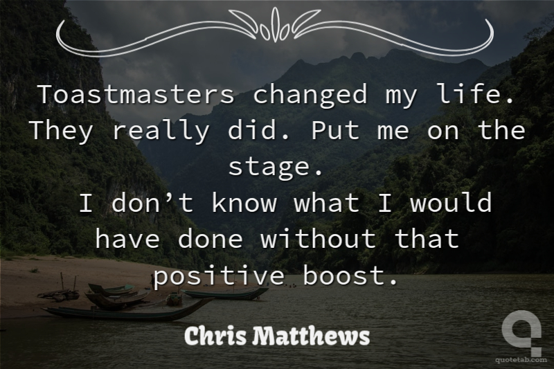 Toastmasters changed my life. They really did. Put me on the stage. I don’t know what I would have done without that positive boost.