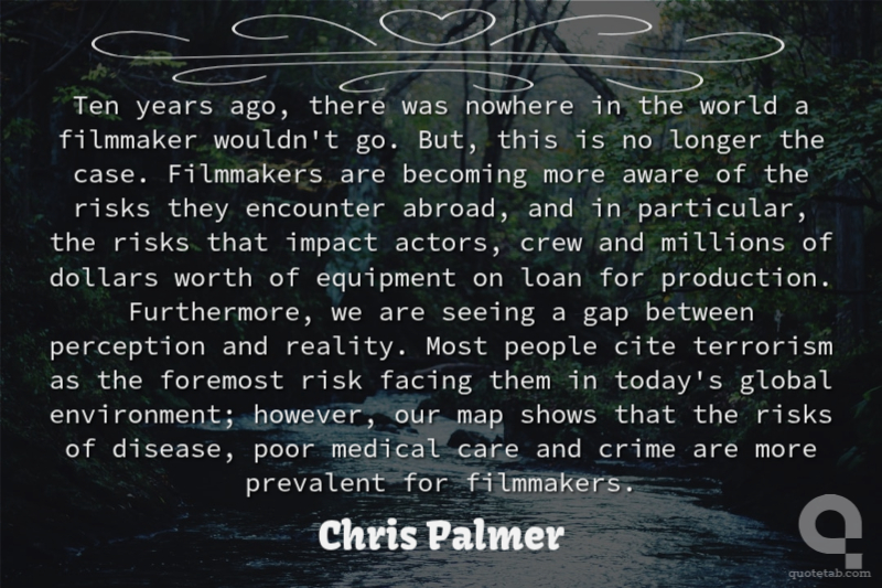 Ten years ago, there was nowhere in the world a filmmaker wouldn't go. But, this is no longer the case. Filmmakers are becoming more aware of the risks they encounter abroad, and in particular, the risks that impact actors, crew and millions of dollars worth of equipment on loan for production. Furthermore, we are seeing a gap between perception and reality. Most people cite terrorism as the foremost risk facing them in today's global environment; however, our map shows that the risks of disease, poor medical care and crime are more prevalent for filmmakers.