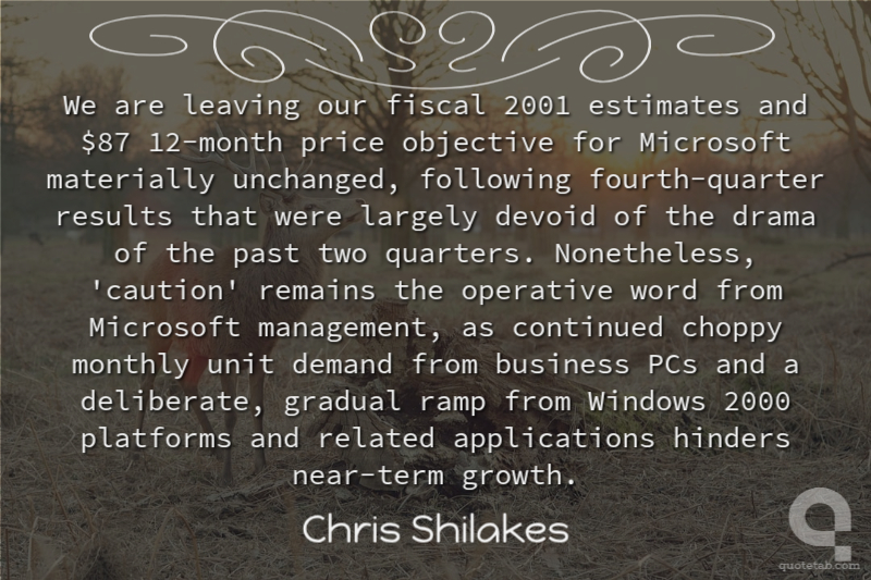 We are leaving our fiscal 2001 estimates and $87 12-month price objective for Microsoft materially unchanged, following fourth-quarter results that were largely devoid of the drama of the past two quarters. Nonetheless, 'caution' remains the operative word from Microsoft management, as continued choppy monthly unit demand from business PCs and a deliberate, gradual ramp from Windows 2000 platforms and related applications hinders near-term growth.