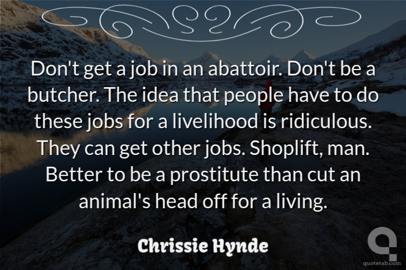 Don't get a job in an abattoir. Don't be a butcher. The idea that people have to do these jobs for a livelihood is ridiculous. They can get other jobs. Shoplift, man. Better to be a prostitute than cut an animal's head off for a living.