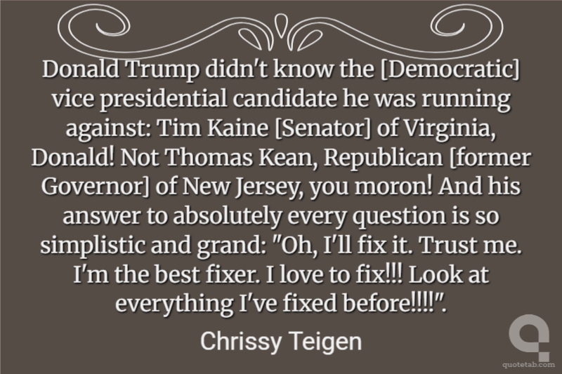 Donald Trump didn't know the [Democratic] vice presidential candidate he was running against: Tim Kaine [Senator] of Virginia, Donald! Not Thomas Kean, Republican [former Governor] of New Jersey, you moron! And his answer to absolutely every question is so simplistic and grand: "Oh, I'll fix it. Trust me. I'm the best fixer. I love to fix!!! Look at everything I've fixed before!!!!".