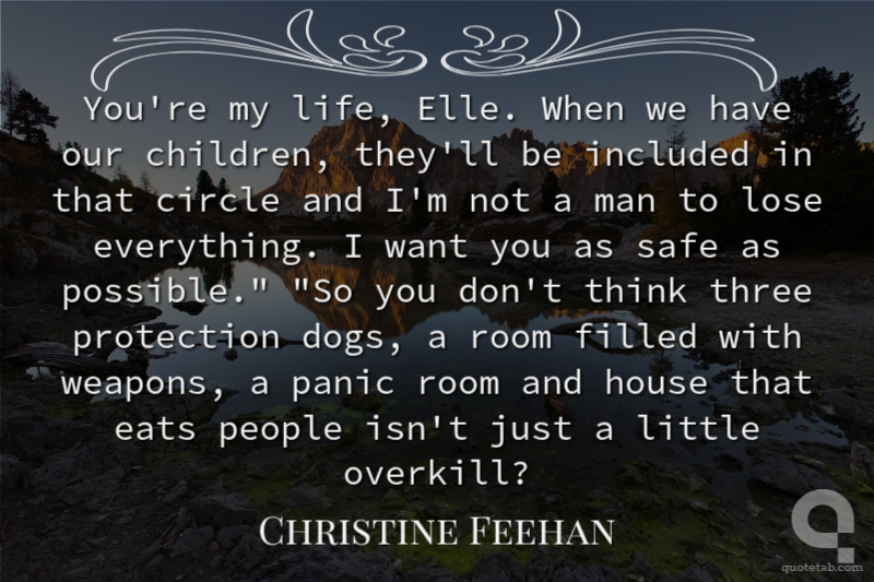 You're my life, Elle. When we have our children, they'll be included in that circle and I'm not a man to lose everything. I want you as safe as possible." "So you don't think three protection dogs, a room filled with weapons, a panic room and house that eats people isn't just a little overkill?