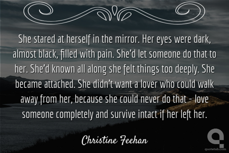 She stared at herself in the mirror. Her eyes were dark, almost black, filled with pain. She'd let someone do that to her. She'd known all along she felt things too deeply. She became attached. She didn't want a lover who could walk away from her, because she could never do that - love someone completely and survive intact if her left her.
