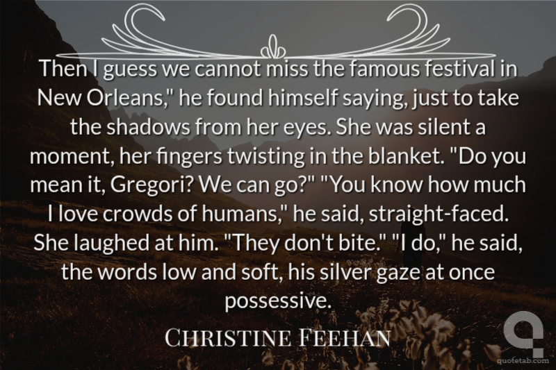 Then I guess we cannot miss the famous festival in New Orleans," he found himself saying, just to take the shadows from her eyes. She was silent a moment, her fingers twisting in the blanket. "Do you mean it, Gregori? We can go?" "You know how much I love crowds of humans," he said, straight-faced. She laughed at him. "They don't bite." "I do," he said, the words low and soft, his silver gaze at once possessive.