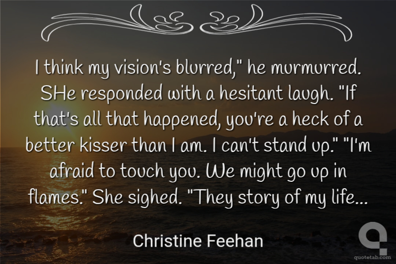 I think my vision's blurred," he murmurred. SHe responded with a hesitant laugh. "If that's all that happened, you're a heck of a better kisser than I am. I can't stand up." "I'm afraid to touch you. We might go up in flames." She sighed. "They story of my life...