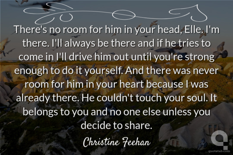 There's no room for him in your head, Elle. I'm there. I'll always be there and if he tries to come in I'll drive him out until you're strong enough to do it yourself. And there was never room for him in your heart because I was already there. He couldn't touch your soul. It belongs to you and no one else unless you decide to share.