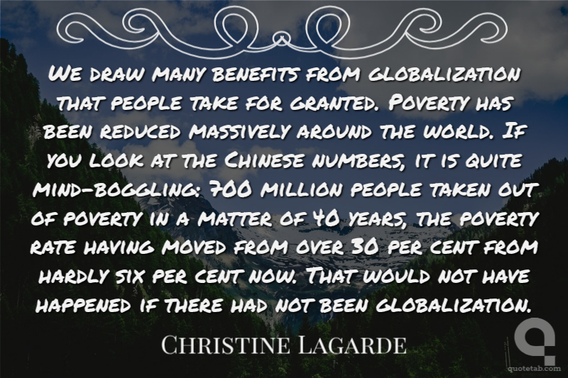 We draw many benefits from globalization that people take for granted. Poverty has been reduced massively around the world. If you look at the Chinese numbers, it is quite mind-boggling: 700 million people taken out of poverty in a matter of 40 years, the poverty rate having moved from over 30 per cent from hardly six per cent now. That would not have happened if there had not been globalization.