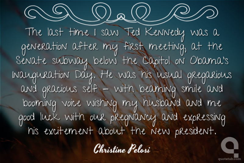 The last time I saw Ted Kennedy was a generation after my first meeting, at the Senate subway below the Capitol on Obama's Inauguration Day. He was his usual gregarious and gracious self - with beaming smile and booming voice wishing my husband and me good luck with our pregnancy and expressing his excitement about the new president.