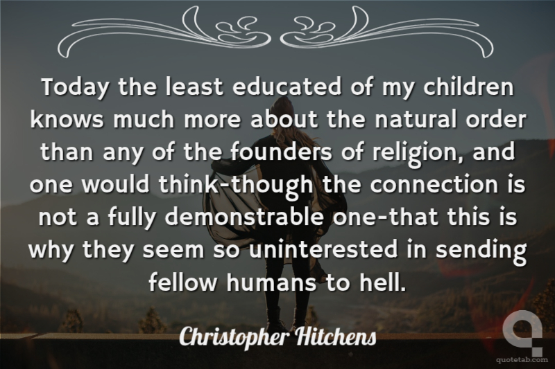 Today the least educated of my children knows much more about the natural order than any of the founders of religion, and one would think-though the connection is not a fully demonstrable one-that this is why they seem so uninterested in sending fellow humans to hell.