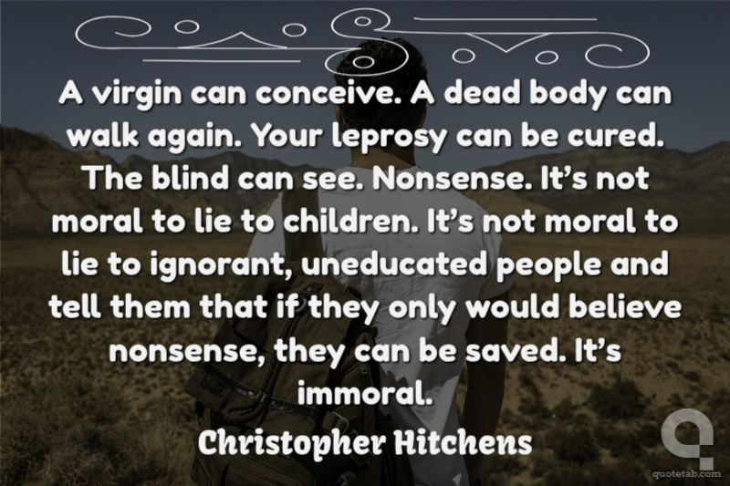 A virgin can conceive. A dead body can walk again. Your leprosy can be cured. The blind can see. Nonsense. It’s not moral to lie to children. It’s not moral to lie to ignorant, uneducated people and tell them that if they only would believe nonsense, they can be saved. It’s immoral.