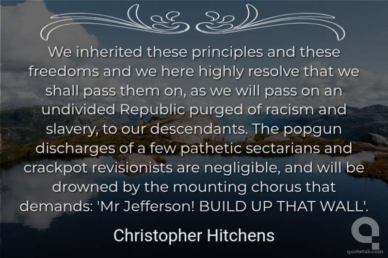 We inherited these principles and these freedoms and we here highly resolve that we shall pass them on, as we will pass on an undivided Republic purged of racism and slavery, to our descendants. The popgun discharges of a few pathetic sectarians and crackpot revisionists are negligible, and will be drowned by the mounting chorus that demands: 'Mr Jefferson! BUILD UP THAT WALL'.