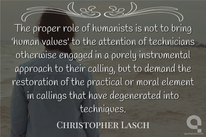 The proper role of humanists is not to bring 'human values' to the attention of technicians otherwise engaged in a purely instrumental approach to their calling, but to demand the restoration of the practical or moral element in callings that have degenerated into techniques.