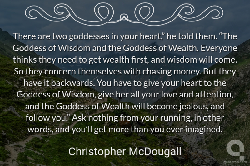There are two goddesses in your heart,” he told them. “The Goddess of Wisdom and the Goddess of Wealth. Everyone thinks they need to get wealth first, and wisdom will come. So they concern themselves with chasing money. But they have it backwards. You have to give your heart to the Goddess of Wisdom, give her all your love and attention, and the Goddess of Wealth will become jealous, and follow you.” Ask nothing from your running, in other words, and you’ll get more than you ever imagined.