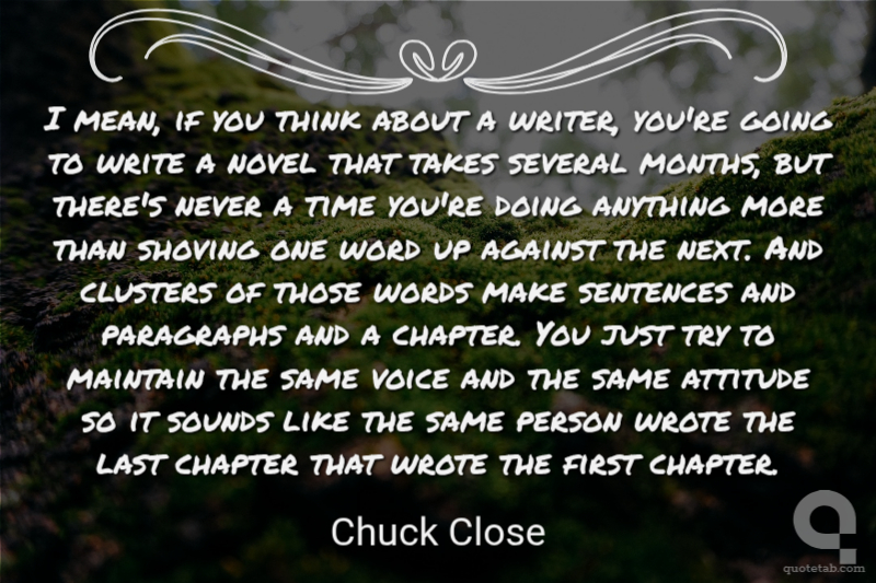 I mean, if you think about a writer, you're going to write a novel that takes several months, but there's never a time you're doing anything more than shoving one word up against the next. And clusters of those words make sentences and paragraphs and a chapter. You just try to maintain the same voice and the same attitude so it sounds like the same person wrote the last chapter that wrote the first chapter.