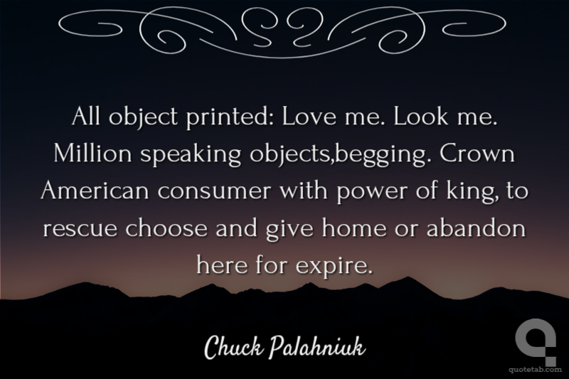 All object printed: Love me. Look me. Million speaking objects,begging. Crown American consumer with power of king, to rescue choose and give home or abandon here for expire.