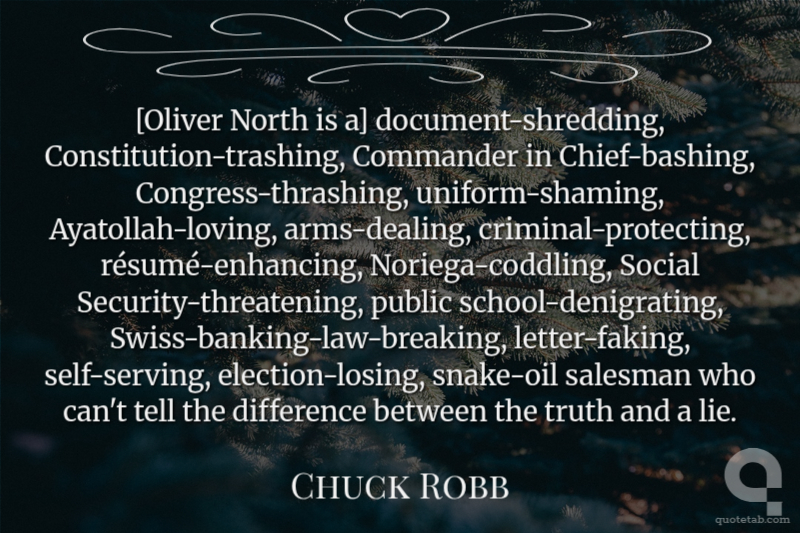 [Oliver North is a] document-shredding, Constitution-trashing, Commander in Chief-bashing, Congress-thrashing, uniform-shaming, Ayatollah-loving, arms-dealing, criminal-protecting, résumé-enhancing, Noriega-coddling, Social Security-threatening, public school-denigrating, Swiss-banking-law-breaking, letter-faking, self-serving, election-losing, snake-oil salesman who can't tell the difference between the truth and a lie.