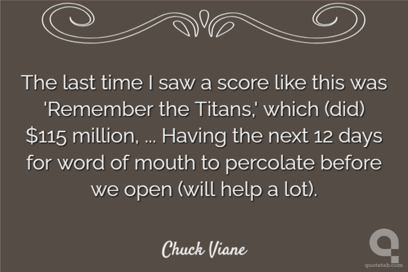 The last time I saw a score like this was 'Remember the Titans,' which (did) $115 million, ... Having the next 12 days for word of mouth to percolate before we open (will help a lot).
