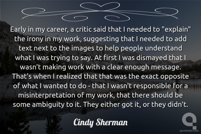 Early in my career, a critic said that I needed to "explain" the irony in my work, suggesting that I needed to add text next to the images to help people understand what I was trying to say. At first I was dismayed that I wasn't making work with a clear enough message. That's when I realized that that was the exact opposite of what I wanted to do - that I wasn't responsible for a misinterpretation of my work, that there should be some ambiguity to it. They either got it, or they didn't.