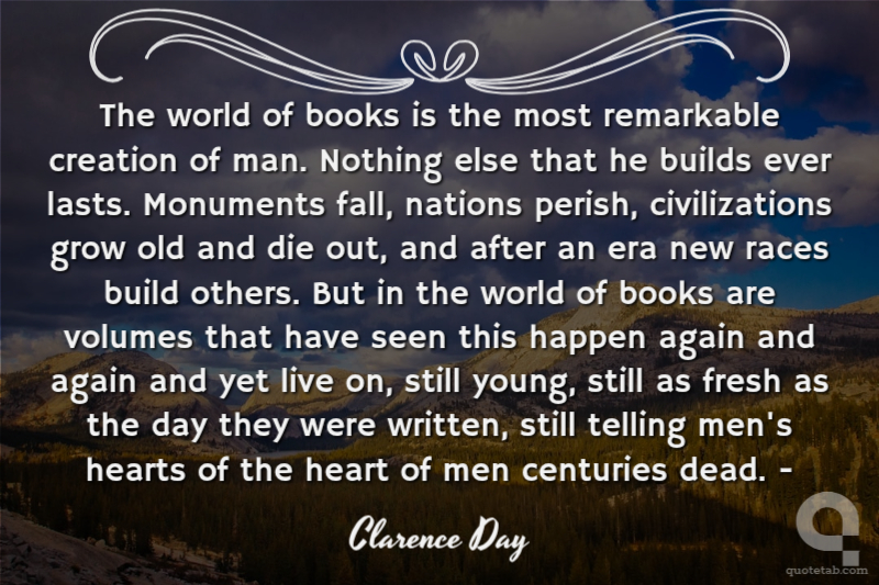 The world of books is the most remarkable creation of man. Nothing else that he builds ever lasts. Monuments fall, nations perish, civilizations grow old and die out, and after an era new races build others. But in the world of books are volumes that have seen this happen again and again and yet live on, still young, still as fresh as the day they were written, still telling men's hearts of the heart of men centuries dead. -