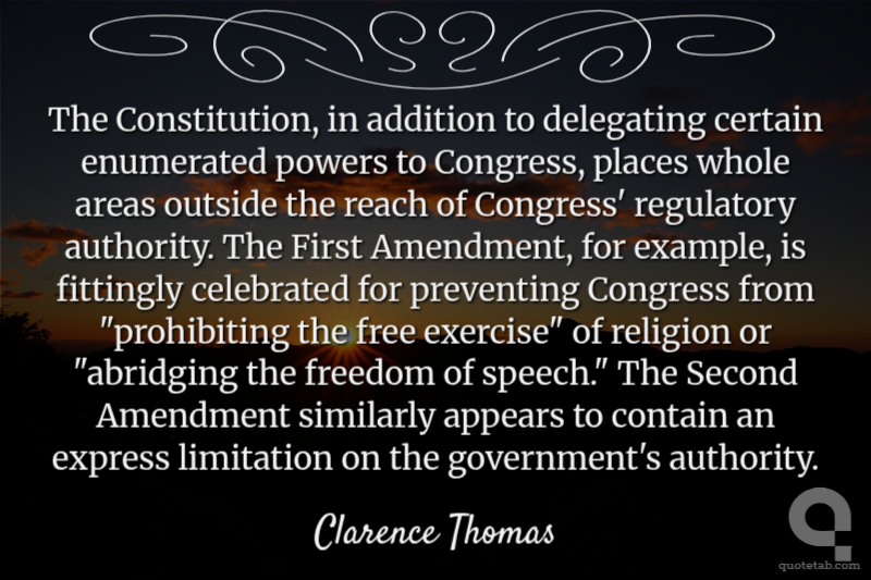 The Constitution, in addition to delegating certain enumerated powers to Congress, places whole areas outside the reach of Congress' regulatory authority. The First Amendment, for example, is fittingly celebrated for preventing Congress from "prohibiting the free exercise" of religion or "abridging the freedom of speech." The Second Amendment similarly appears to contain an express limitation on the government's authority.